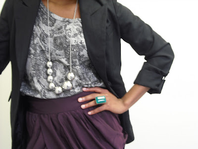 Got the ring in Soho (2 finger wire ring with stone on top), Necklace from Vintage Thrift and torquoise wire earrings at a stand in Soho as well. See more pics here of this outfit!