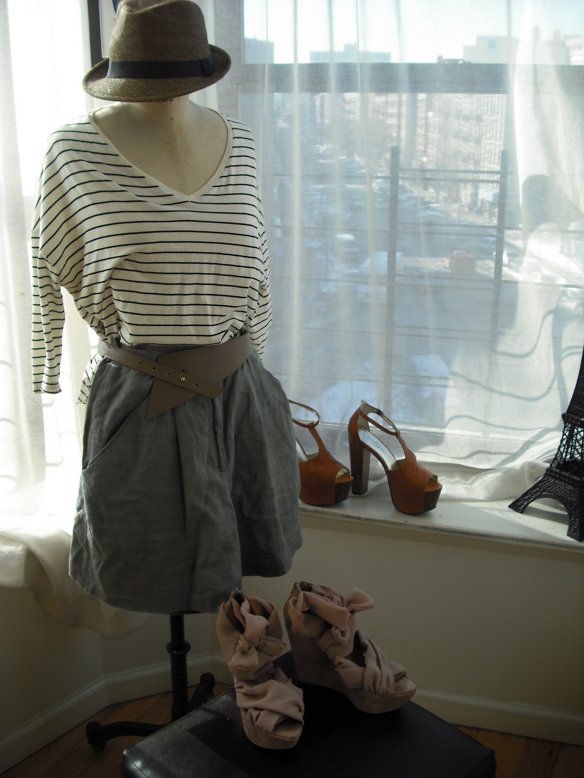 I love these linen army green shorts I thrifted from Goodwill last summer for less than $5. They are super comfortable and go with just about anything. I like paired them with this soft pastel pink in the Top Shop Chiffon/Suede wedges. Also paired this outfit with a great vintage belt I got here at Beacons Closet in Brooklyn during a thrifting trip.
