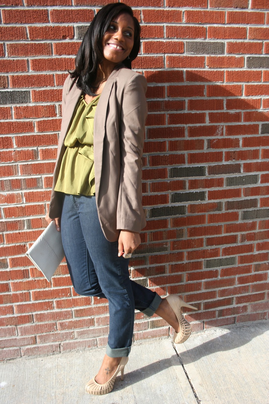 I got this awesome blazer from Loehmanns a little while ago. I love it. The neutral color lets me wear it with just about anything, but it looks better with a bold pop of color!