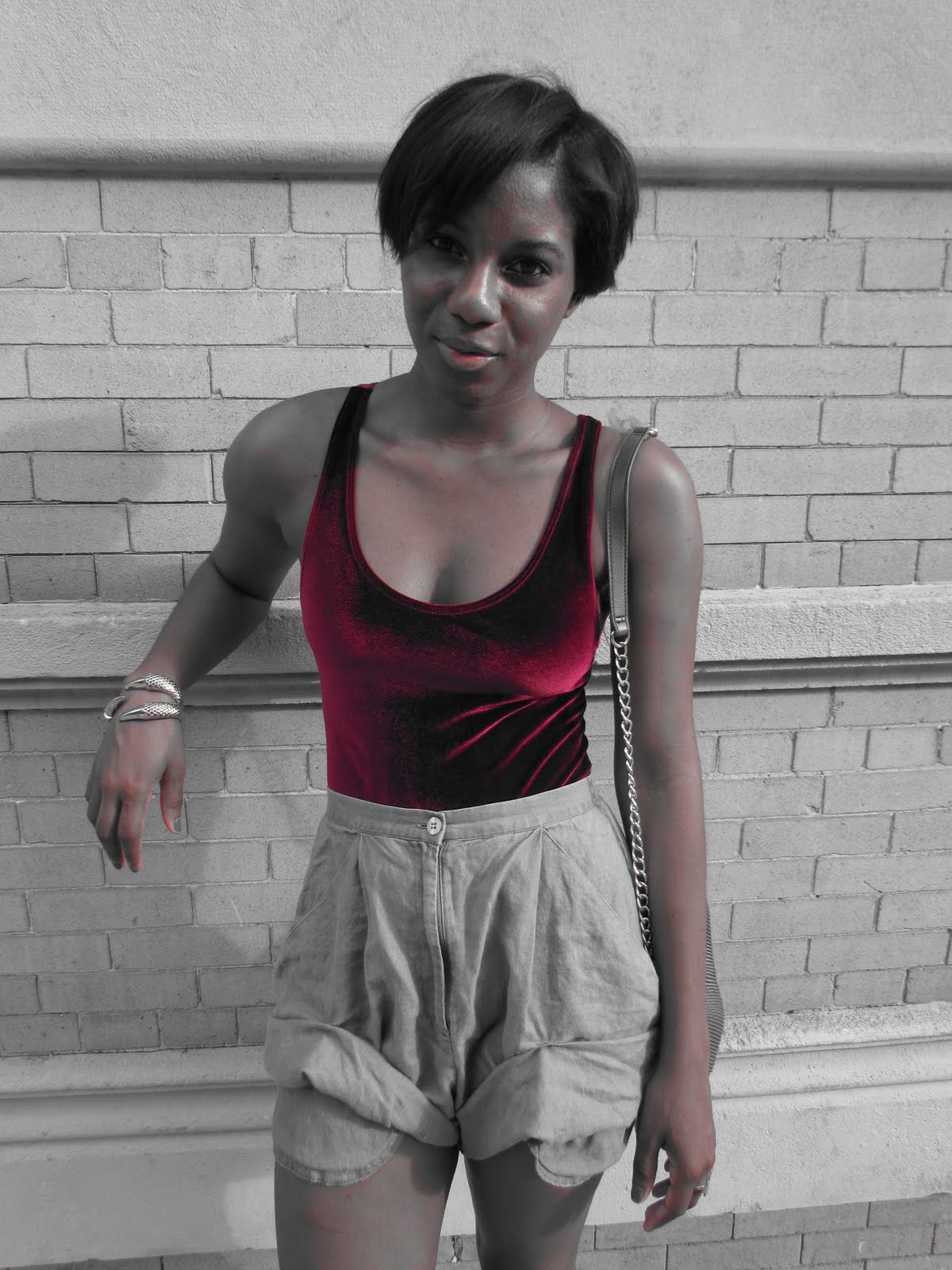 It’s official..I’m obsessed with velvet. See more of my velvet loves here and here. I dont know why but I just am..so when I saw this bodysuit in AA I snatched it up so quick I almost knocked down the rack. Since the color is so vibrant I paired it with my vintage thrifted muted colored shorts…see them worn differently here. They are actually longer and hit mid thigh but I rolled them up and stapled them..lol. I can’t sew and the staples actually look kinda cool.