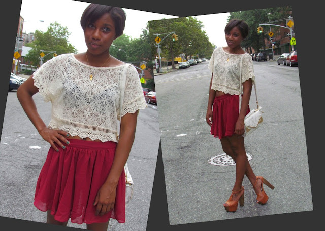 I am in love with this outfit the burnt orange skirt and the lace-y crochet top – not many people can pull it off!