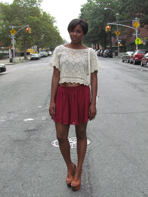 I am in love with this outfit the burnt orange skirt and the lace-y crochet top – not many people can pull it off!