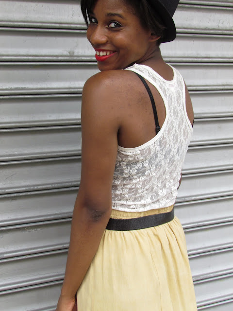 ;ove the yellow skirt and the hat adds a nicee vintage touch to the look