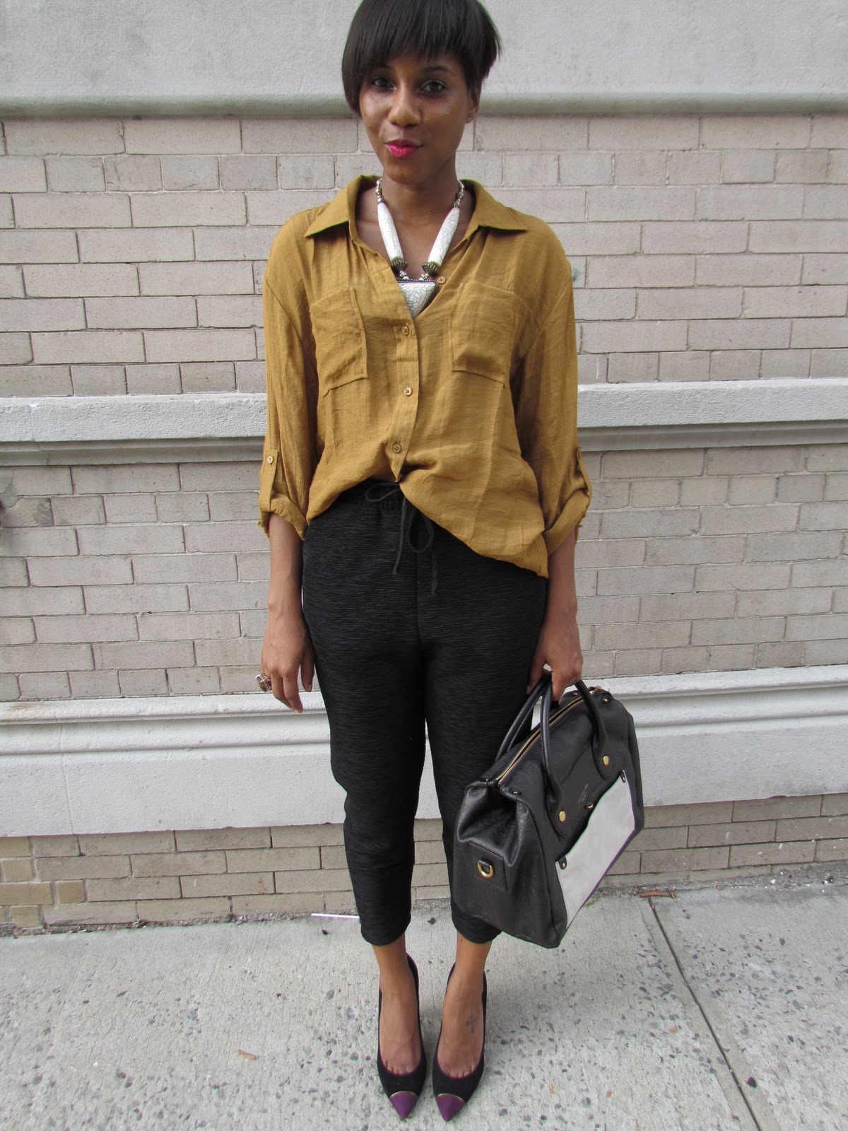Love the bag and the pants. Those pants look familiar! The jacquard type of material, a little ruched but comfy right?