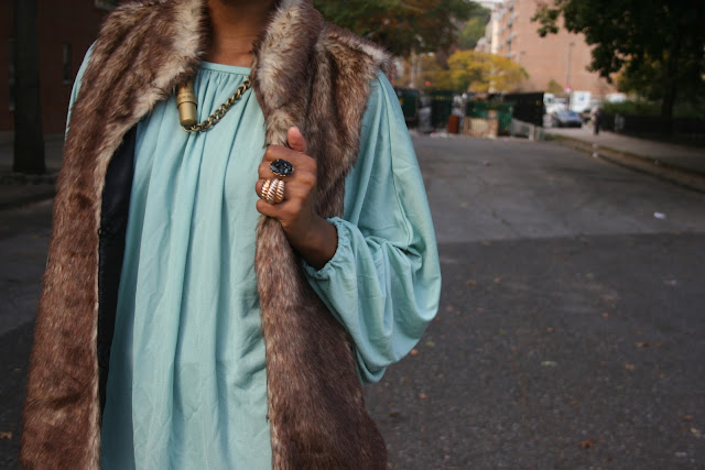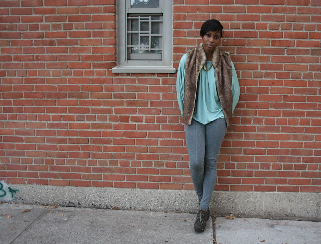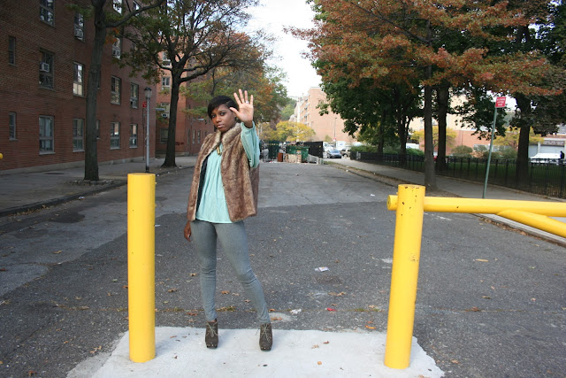 Got this necklace at Housing Works Vintage Me this Vintage Me That shopping excursion. The vest if from Marshalls, also got this fabulous faux fur vest at Marshalls as well. Less than $25 dollars!