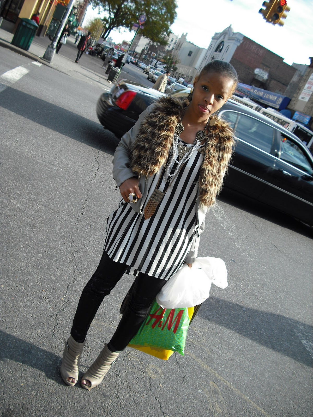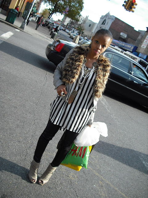 Sequin black leggings, peep toe leather booties, strips, faux fux, large statement necklaces mixed with pearls