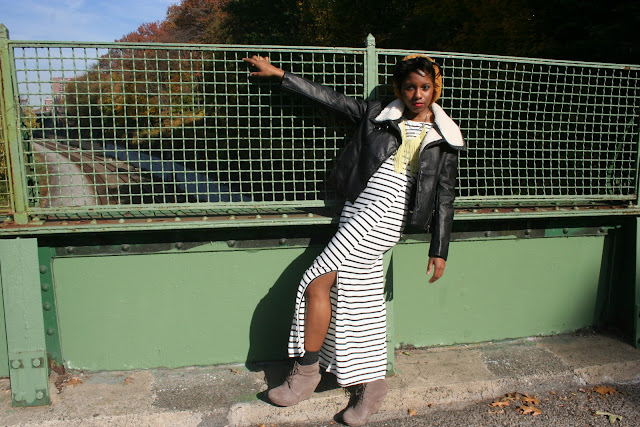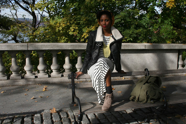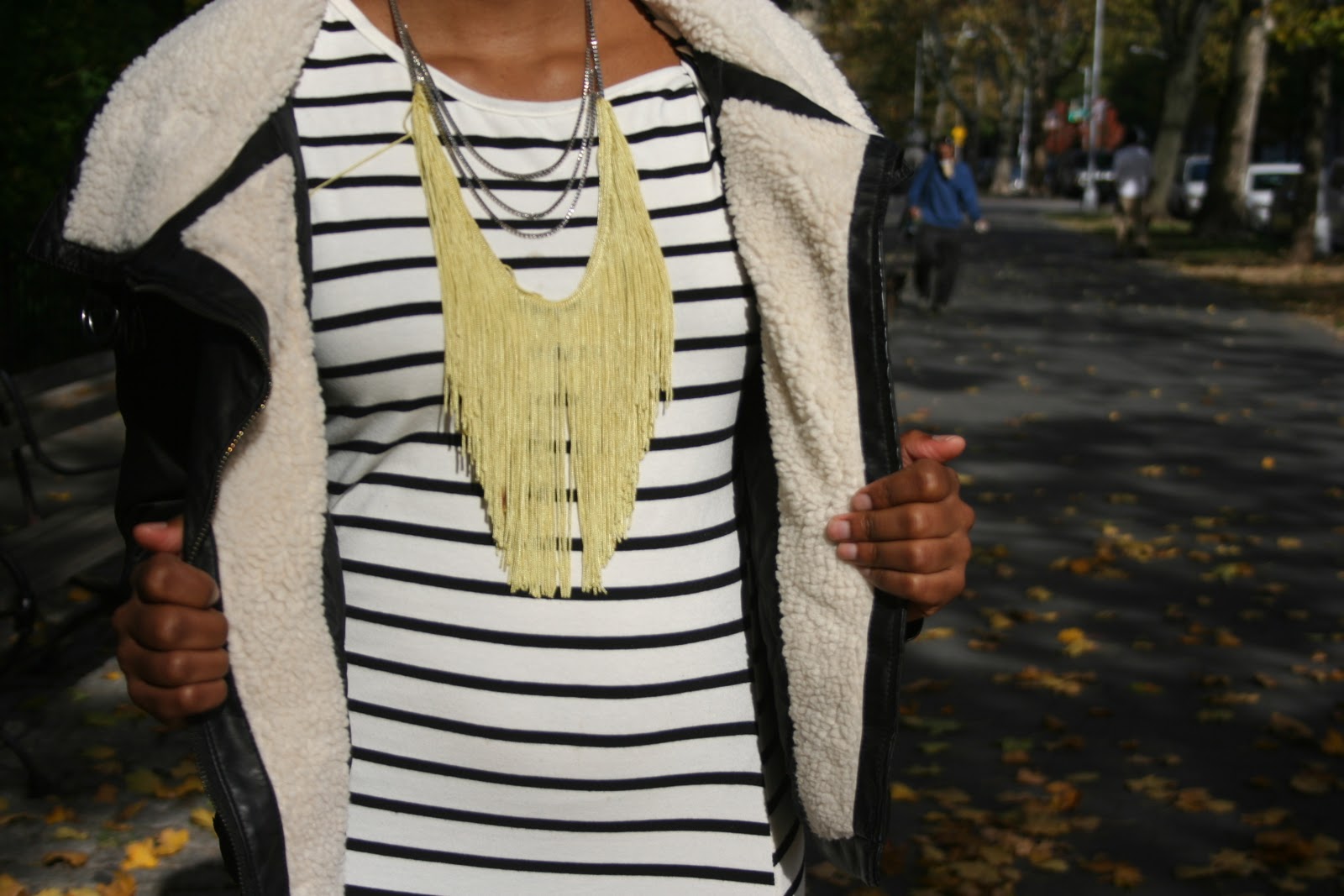 loving the contrast in this outfit!! the stripes, the highlighter yellow fringe necklace and that awesome shearling leather jacket!