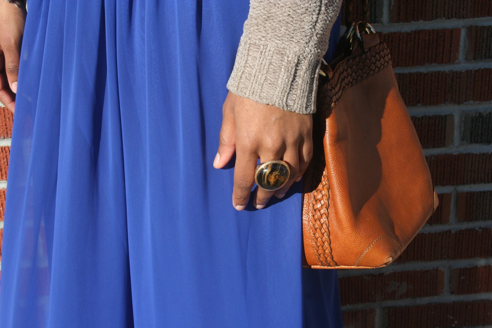 I’ve worn this amazing skirt from American Apparel once as a dress but wanted to winterize it up for the season. I love the pop of color and decided to pair it with camel and cognac colors.