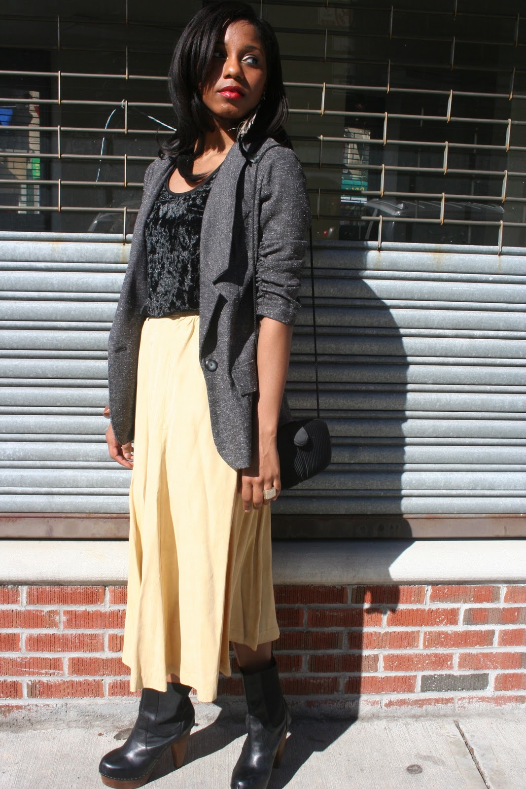 I was thifting a few days ago at the Salvation Army on 125th St in Harlem (During my lunch break…I know I know I’m a thriftaholic) when I came across this lovely pale yellow A-Line Skirt. I fell in love with it. I got it for only $4…Fashion STEELE! I’ve been really into maxi skirts or ankle length skirts lately with either fitted blazers or oversized sweaters. The combination is perfect for those balmy days in later Winter/early Spring.