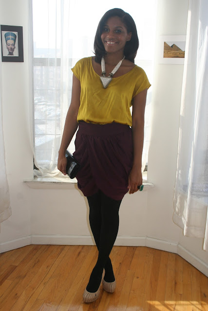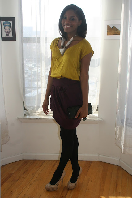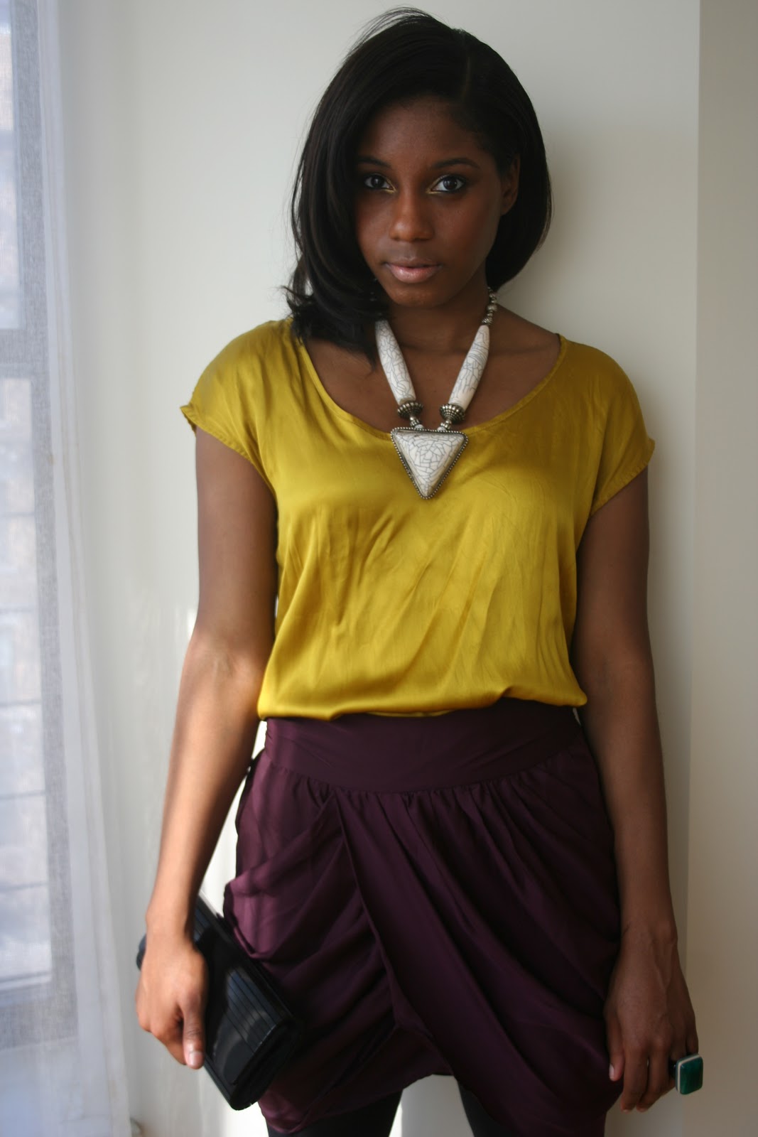 I love the mustard with the plum! The mustard goes great with your skin tone. And the chunky necklace finishes it perfectly!
