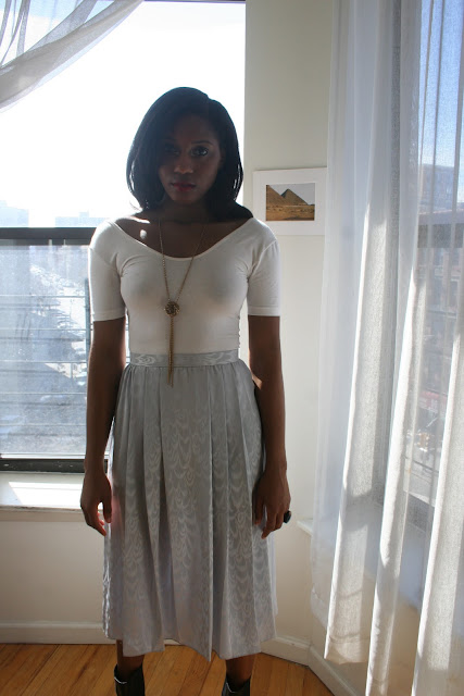 Lovely skirt and looks great with the bodysuit. I can see how it will easily go into Spring with your JS platforms or any of your other wedges. I want to be your thrifting partner when I come to NY. : )