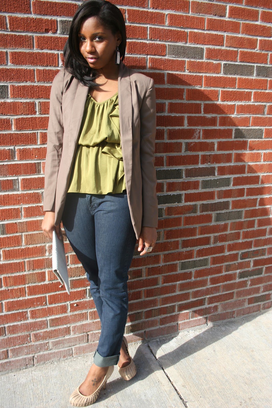 Really cute outfit. I love that olive colored blouse. Such great deals as Marshalls.
