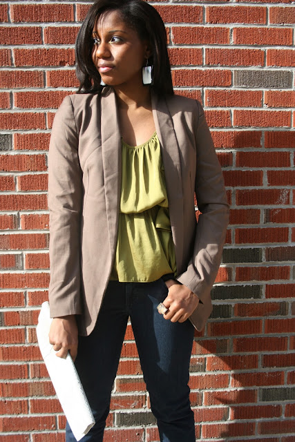 I got this awesome blazer from Loehmanns a little while ago. I love it. The neutral color lets me wear it with just about anything, but it looks better with a bold pop of color!