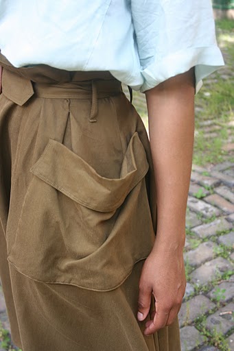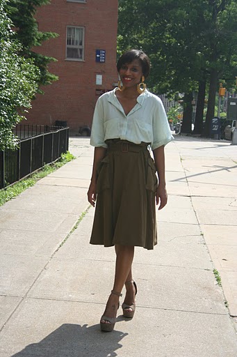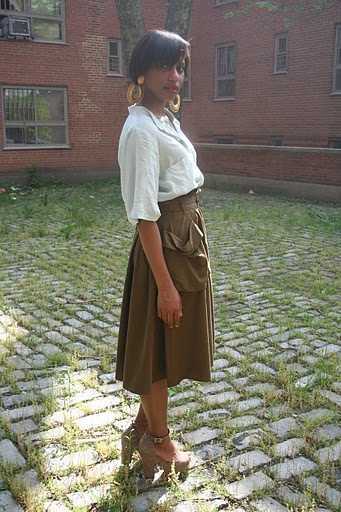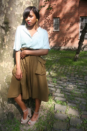 I love this casual-chic look. The oversize shirt and the adorable skirt.
