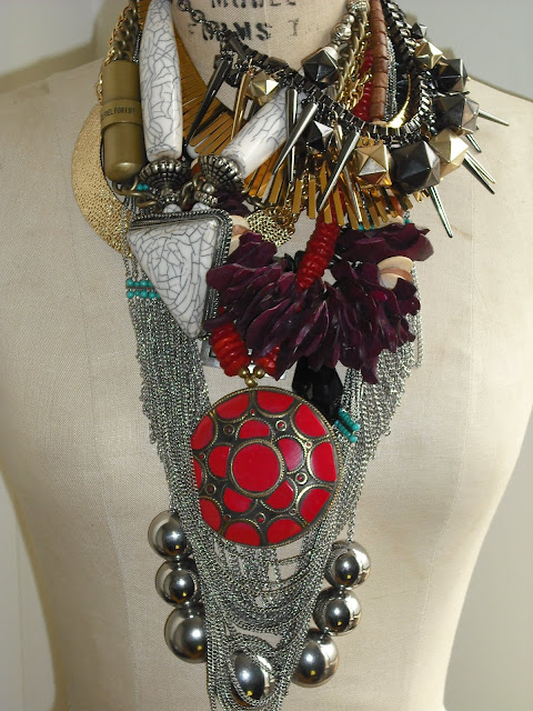 I hang all my necklaces around the neck of my vintage dress form. I got it on craigslist fot $20. I had to go about an hour by train to Brooklyn to get it but it was worth it. It also weights about 30 pounds.