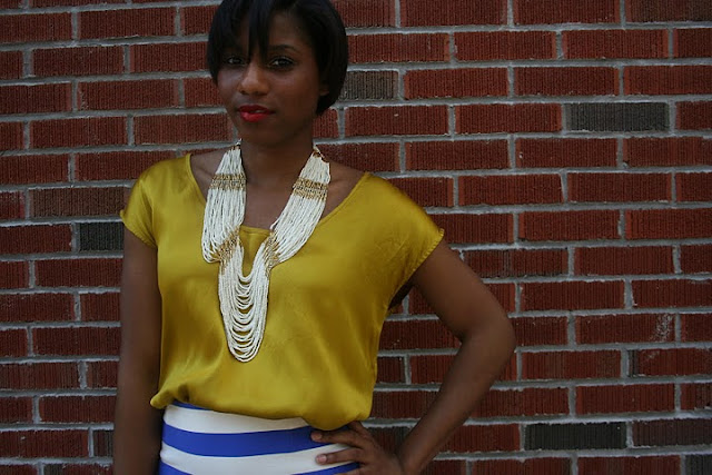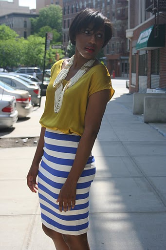 love the combination with the striped skirt and the mustard shirt! just lovely