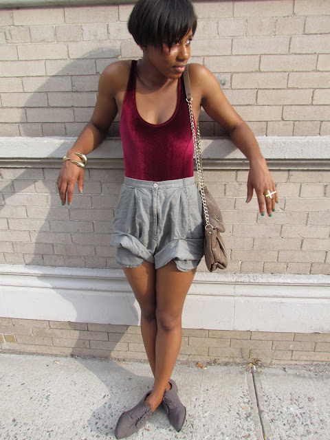 It’s official..I’m obsessed with velvet. See more of my velvet loves here and here. I dont know why but I just am..so when I saw this bodysuit in AA I snatched it up so quick I almost knocked down the rack. Since the color is so vibrant I paired it with my vintage thrifted muted colored shorts…see them worn differently here. They are actually longer and hit mid thigh but I rolled them up and stapled them..lol. I can’t sew and the staples actually look kinda cool.
