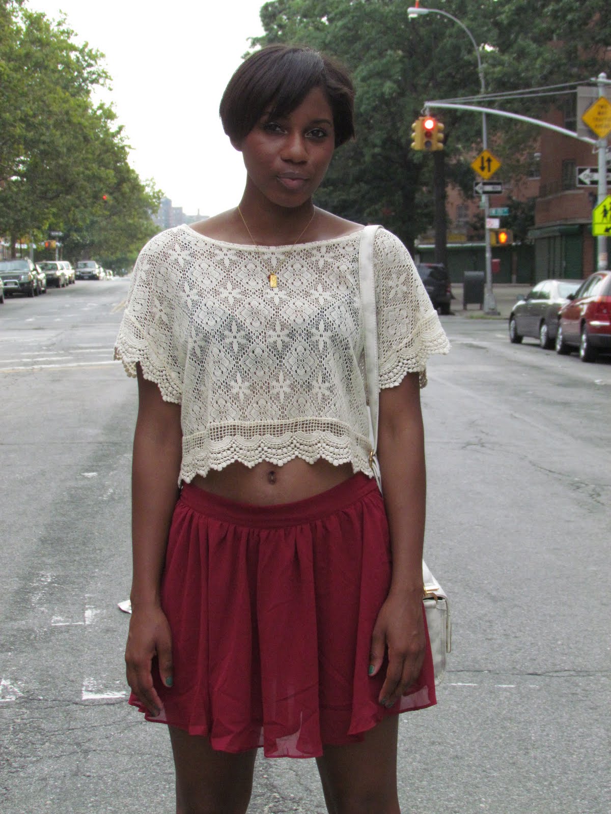 I am in love with this outfit the burnt orange skirt and the lace-y crochet top – not many people can pull it off!