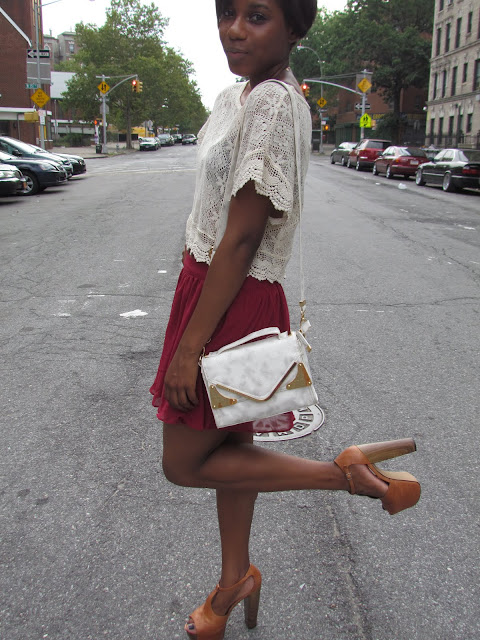 Love the combination of cream and burgundy. One of my favs. The pattern on that lace top is beautiful and the shoes are killer!