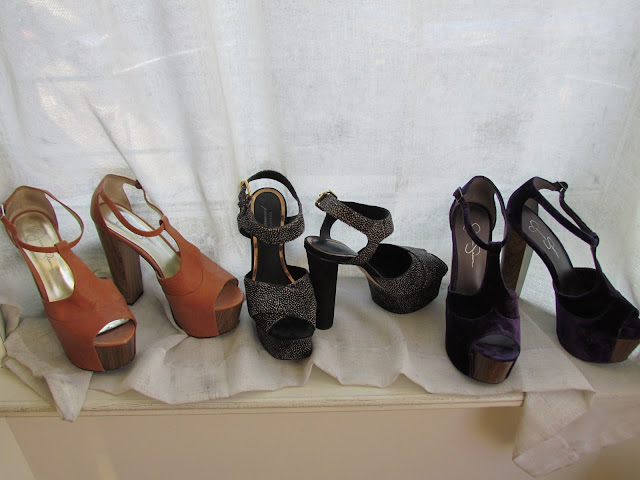 The Platform Collection featuring: Jessica Simpsons Dany Platforms in Caramel and Purple Velvet and Top Shop Podium Platforms in the center.