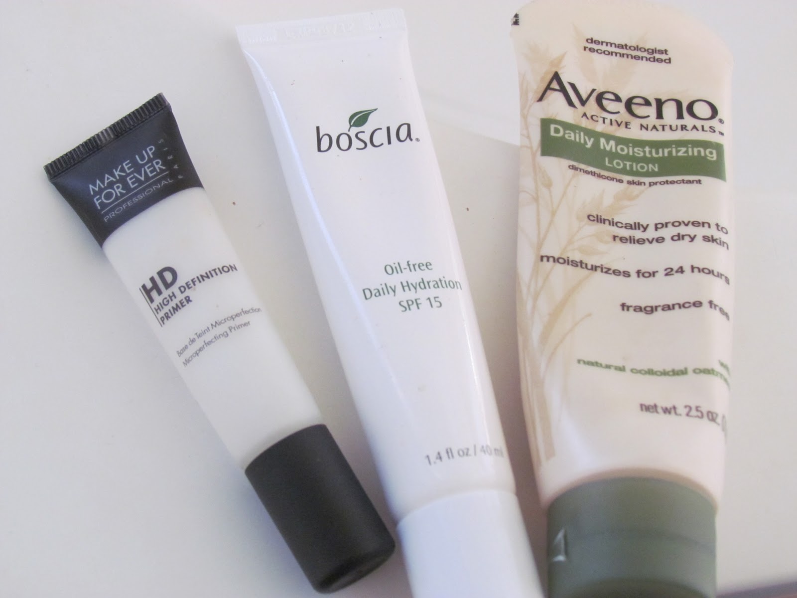 Aveeno is the only lotion my skin can tolerate. It keeps my skin from being so dry after applying all those acne treatments. I usually mix a bit of the Aveeno lotion with the Boscia SPF lotion. If I’m going to wear makeup that day, after that dries I put a little Make-Up Forever primer on.