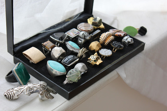 My collection consist mostly of cocktail rings, a lot of which I pick up while thrift shopping.