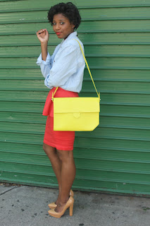 i love the color combination of the bright neon purse and the skirt. i believe this bag is sold out but get a similar one here or here. with a neutral shoe like these elegant Charles Jourdan’s that I picked up at Loehmanns it all came together. this denim top is one of my favorites. a fashion STEELE at $19 during an H&M sale. sometimes the men’s department has just what i’m looking for lol. so im digging peplum but i only really like peplum skirts. the shirts…not so much…but i will never say never because im sure some way i’ll end up with one.